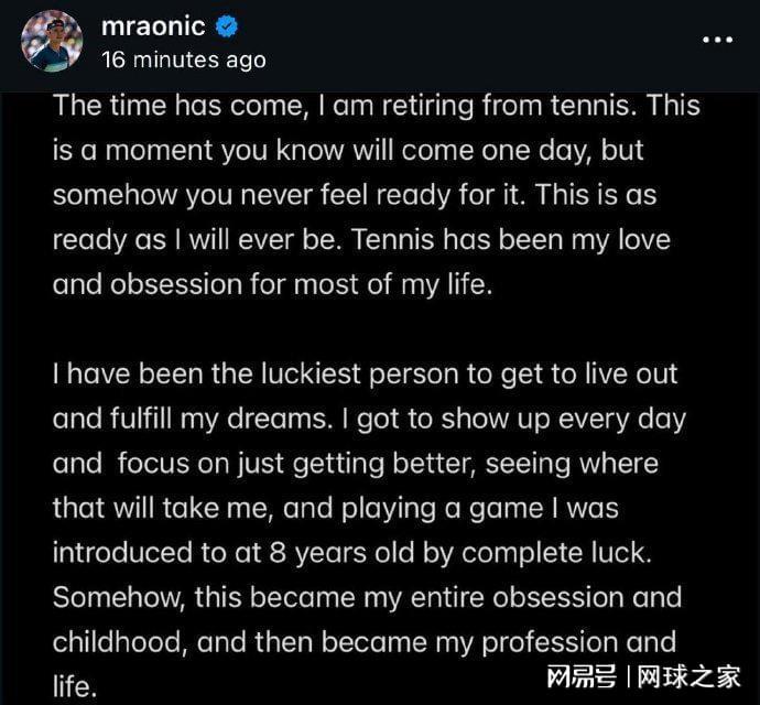 北京时间今晨,加拿大名将米洛斯-拉奥尼奇在个人社交媒体上发文,宣布结束自己的网球生涯正式退役。35岁的拉奥尼奇有“加拿大火炮”、“拉神”之称,曾在2016年打进温网决赛收获亚军,创造了加拿大男网的历史,最高世界排名来到过第三位,获得过92场大满贯的胜利,在90后球员中仅次于小兹维列夫和迪米特洛夫。过去几个赛季,拉奥尼奇始终受伤病困扰,偶有复出也是以失利告终。如今看来,他的伤病已经到了非常严重的程度,无法再支撑他征战职业赛场了。再见了拉神!祝他退役之后的生活一切都好!