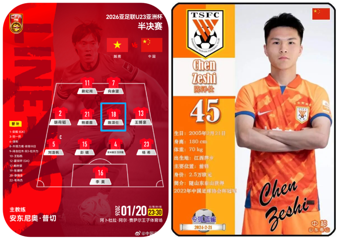 2005年,陈泽仕出生于上栗县桐木镇,从小就展现出了出色的足球天赋,以16岁239天的年龄刷新了山东泰山队史上在正式比赛中最年轻的出场纪录。司职中场的陈泽仕是主帅安东尼奥手中的“轮换奇兵”,半决赛中他迎来本届赛事首次首发,在后腰位置组织有序,为球队晋级立下战功。